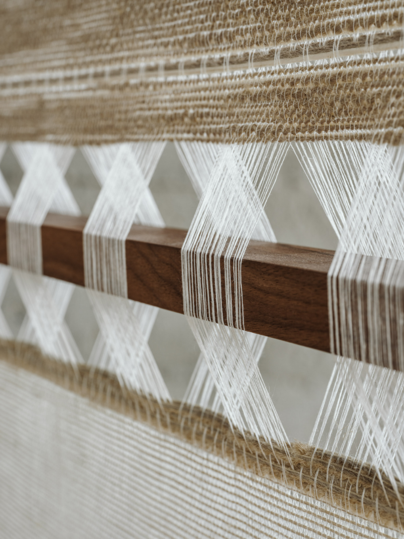 From research to practice, authenticity is rhymed with innovation and manual techniques are interwoven with digital practice. Craftmanship manifests itself in the textiles, the wood and custom brass hinges. A careful selection of yarns was followed by multiple samples and finally the fabric was constructed weft by weft. At the intersection of design and art, yarn is used to write. The final composition takes shape by intuitively removing threads where the design calls for transparency.