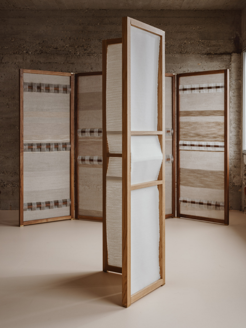 This exclusive collection is available in a limited edition of 8 pieces + 2 artist prints, ensuring uniqueness. It starts from a penchant for understated, natural and sensory materials. Each design includes a walnut or oak structure that elegantly frames the woven textiles. The strong connection to Belgian textile heritage leads to the use of linen, wool and paper where yarns in various natural shades and thicknesses are blended into harmonious compositions with subtle translucency and light filtering.
